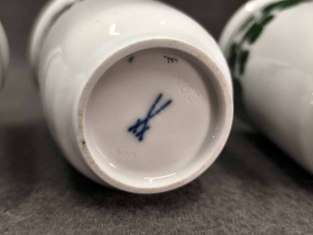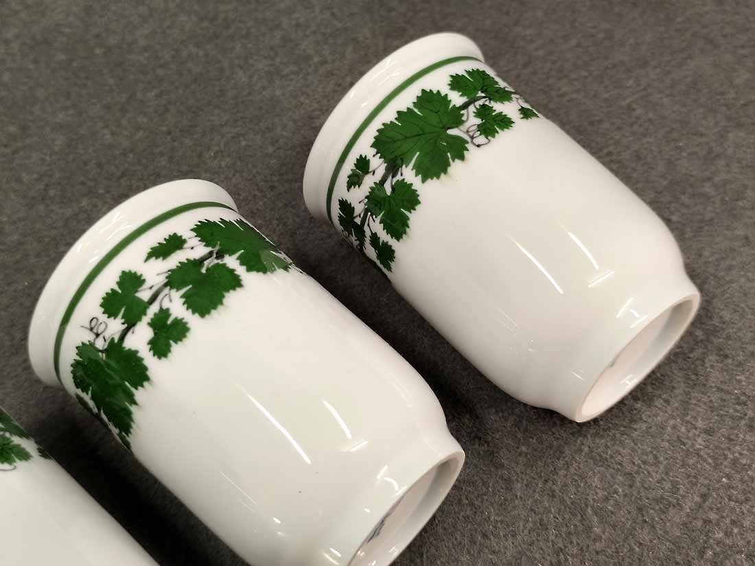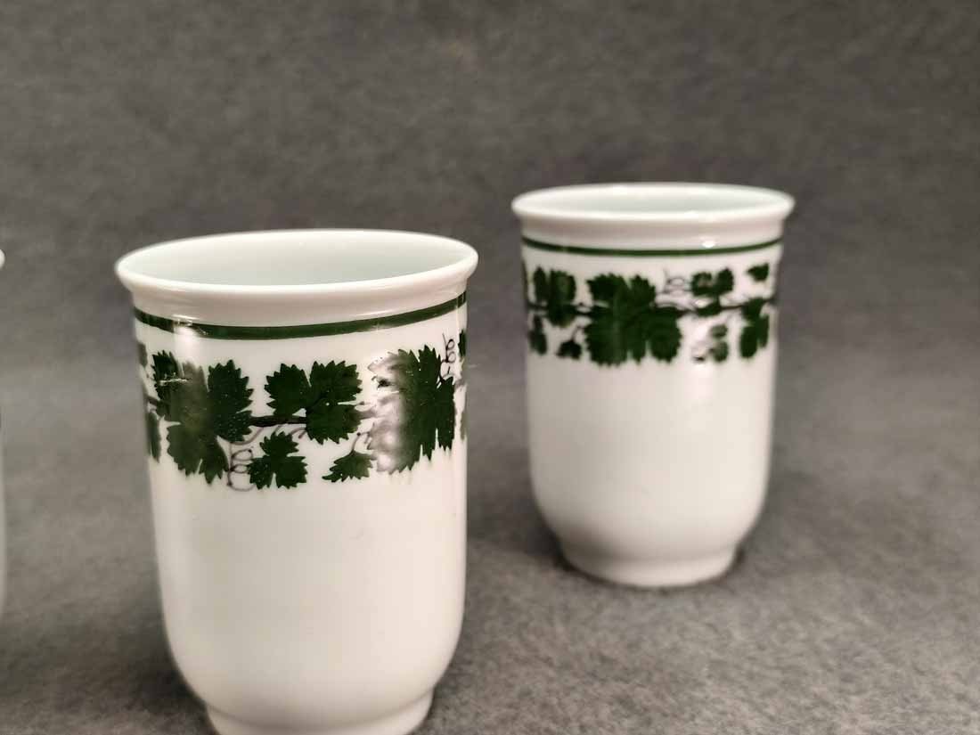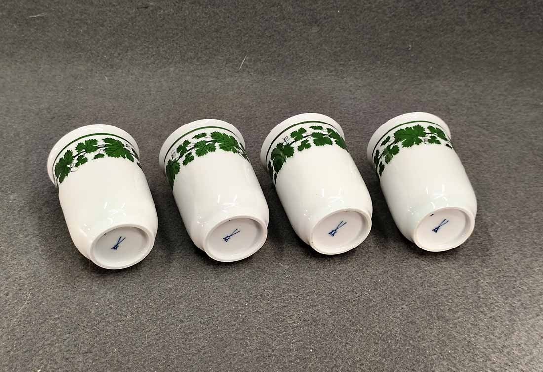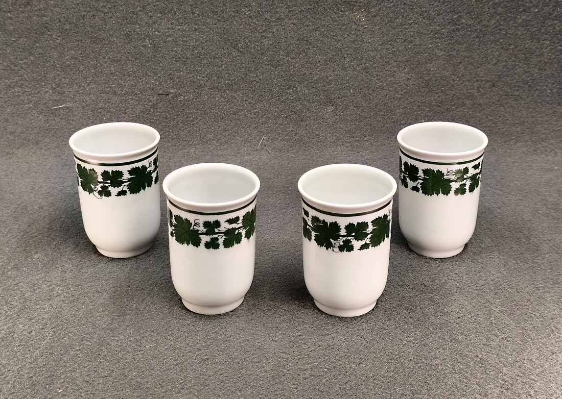 Meissen Weinlaub; 4 Becher, Weinbecher/Saftbecher H. 8,5 cm, D. 6 cm. Sehr guter Zustand ohne Beschädigungen, keine Gebrauchsspuren. Schwertermarke der Manufaktur Meissen 3x gestrichen.