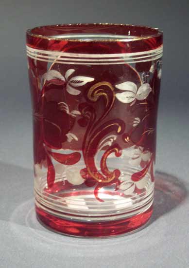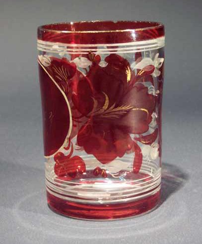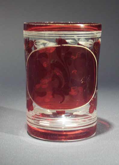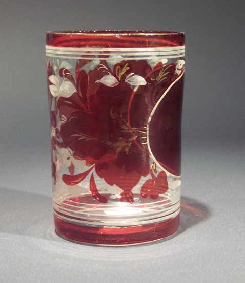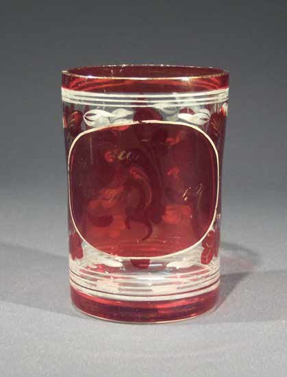 Becherglas 1. Hälfte 19. Jh. Zylindrisches Glas gestaltet in Rotätze, Weißemaille und Gold. Schauseitig ovale Kartusche in Rot mit Resten einer Widmung in Gold (stark berieben). Gold berieben.
